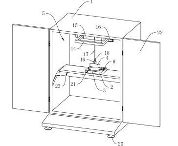 參照圖1,包括殼體1、工作臺2、盛液盒3和標準板4,殼體1內(nèi)設置有工作腔5,殼體1底部設置有多個支撐腳20,在本申請實施例中,支撐腳20設置為四個,四個支撐腳20設置于殼體1的四角位置;殼體1上鉸接有兩轉(zhuǎn)動門22;工作臺2設置于工作腔5內(nèi),工作臺2上開設有與盛液盒3適配的放置槽21,盛液盒3可放置于放置槽21中,標準板4設置于盛液盒3上方,標準板4通過升降結(jié)構(gòu)可升降連接于殼體1上,工作臺2上固定連接有水平儀6,在本申請實施例中水平儀6選用氣泡式水平儀,也可選擇其他體積較小的水平儀;工作臺2和殼體1之間設置有用于調(diào)平工作臺2的調(diào)平結(jié)構(gòu)。
