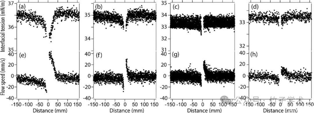圖4是液滴周圍界面張力(上)和表面流速(下)的代表性空間分布[初始BS濃度:(a,e)0μM,(b,f)20μM,(c,g)30μM,和(d,h)50μM]。