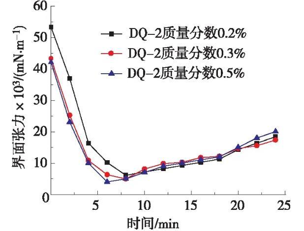 測定低界面張力表面活性劑DQ-2體系的質量分數分別為0.2%,0.3%,0.5%的油水界面張力,不同濃度目標體系的油水界面張力隨時間變化曲線見圖1。