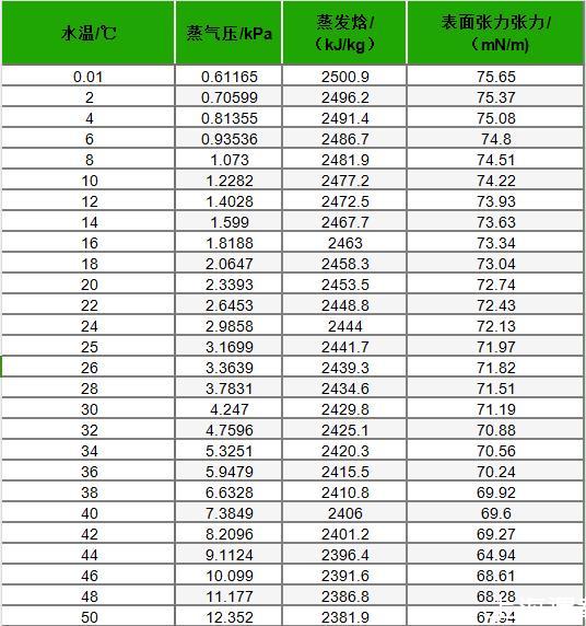 不同溫度下水的蒸氣壓、蒸發焓及表面張力