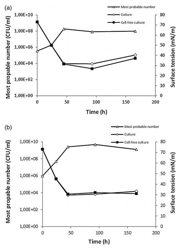 菌株紅球菌屬。 菌株 LF-13 和紅球菌屬。 大約 2 天后,菌株 LF-22 達到穩定期(圖 1)。 LF-13 和 LF-22 的培養物表面張力的最低值分別為 31.8 和 29.3 mN m-1,當培養物達到穩定期時(圖 1)。 無細胞制劑的值顯示出與培養物類似的降低,表明生物表面活性劑被釋放到培養基中。 從工業角度來看,將生物表面活性劑分泌到培養基中的分離物很有趣,因為這使得生物表面活性劑的純化過程更簡單。 [16,44,45]