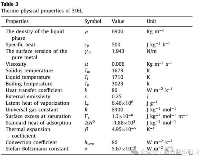 圖1(A)中顯示了計算領域的圖形說明。計算域的大小設置為20 mm×2 mm×25 mm。計算域劃分為1.25億個邊長為0.02 mm的六面體網格。在初始狀態下,將厚度為20 mm的下部設置為工件層(階段2),將厚度為5 mm的上部設置為環境空氣層(階段1)。前壁(Y=0)被設置為對稱邊界條件,頂面(Z=25 mm)被設置為壓力輸出邊界條件,其他表面被定義為壁邊界條件。使用了Ansys-FLUENT®軟件用于模擬。采用C語言編寫的用戶自定義函數(UDF)實現光線跟蹤過程。圖1(B)顯示了光線追蹤過程的驗證案例,在該案例中,一束平行光束被射入具有不同表面粗糙度的方腔。圖1(C)表明,在高Ra條件下,隨著表面粗糙度的變化,能量分布明顯改變,更多的能量集中在第一反射區。表3列出了模擬中使用的物理特性。