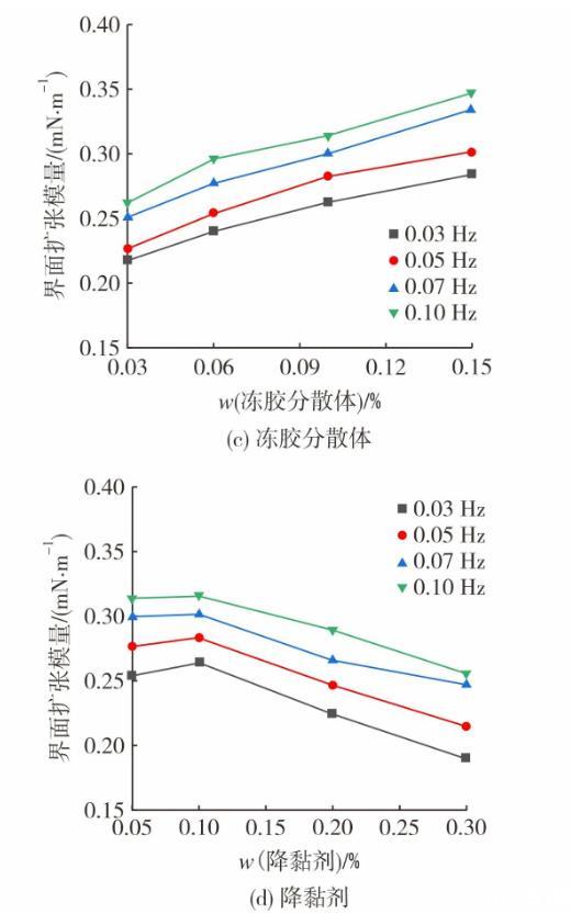 圖2為體系組成對(duì)動(dòng)態(tài)界面張力及界面擴(kuò)張模量的影響。圖2(a)和圖2(c)呈現(xiàn)了凍膠分散體質(zhì)量分?jǐn)?shù)對(duì)界面流變性質(zhì)的影響。其中,降黏劑質(zhì)量分?jǐn)?shù)保持為0.10%。隨著振蕩時(shí)間的增加,體系界面張力逐漸趨于穩(wěn)定。凍膠分散體在高質(zhì)量分?jǐn)?shù)時(shí),穩(wěn)定界面張力明顯更高,這是由于在降黏劑質(zhì)量分?jǐn)?shù)不變時(shí),油水界面上降黏劑分子數(shù)量相對(duì)固定凍膠分散體在油水界面的吸附量隨質(zhì)量分?jǐn)?shù)增大逐漸增加,擠占了降黏劑分子在界面吸附位置。同時(shí),由于體系黏度上升,降低了降黏劑向界面擴(kuò)散的速度,導(dǎo)致界面張力增加。體系黏度提高,增加了動(dòng)態(tài)擴(kuò)張模量,在高質(zhì)量分?jǐn)?shù)凍膠分散體條件下,黏彈性提升效更加顯著。