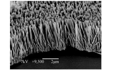 ZnO晶核在FTO導電玻璃表面的分布情況和分布的粒徑范圍對納米線的生長及性能有重要的影響。圖2顯示1 mmol/L的Zn(Ac)2乙醇溶液接種5次,晶核在FTO導電玻璃表面分布比較均勻,粒徑的分布情況也較好,一般在20~40 nm。圖3顯示納米ZnO纖維在FTO玻璃上的生長情況,納米ZnO纖維垂直FTO向上生長,長度基本一致,形成了均勻分布的納米簇,增加了與蛋白的接觸面積,減少了電流傳遞時的電阻,從而可以提高光電池的光電轉化效率。