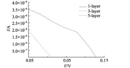 圖5不同層數菠菜類囊體膜LB膜組裝成光電池的I-V曲線
