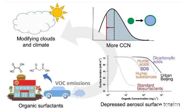 研究進一步表明,忽略表面張力降低效應將導致在云中典型過飽和度范圍內(0.23%-0.76%)超細云凝結核(直徑<100 nm)的數濃度降低6.8%-42.1%。綜上所述,本研究提供了有機物降低城市氣溶膠表面張力的新證據,表面張力的降低將增加云凝結核的數量,從而影響云和氣候(圖3)。