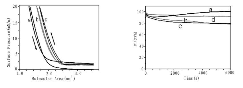 圖3化合物1的壓縮/擴(kuò)張循環(huán)等溫線(左圖,a,b,c分別為1,2,3次)和不同亞相上的膜穩(wěn)曲線(右圖,a純水,b乙二酸,c丙二酸,d丁二酸)