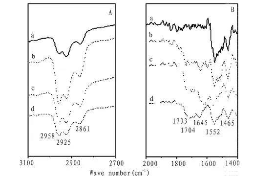 圖5化合物1在不同亞相時(shí)轉(zhuǎn)移30層膜的FT-IR圖譜