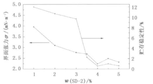 圖1乳化劑用量對界面張力和貯存穩定性界面張力的影響