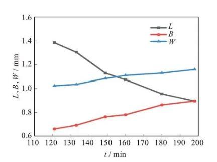 可以看出,從121 min開始,可以觀察到橢球形液滴已經(jīng)初步形成,即從121 min開始計(jì)算橢球形液滴的三軸長(zhǎng)度,根據(jù)實(shí)驗(yàn)裝置圖,L和B為x和y方向的液滴長(zhǎng)度,W為z方向的長(zhǎng)度,根據(jù)公式W=R03/(LB)計(jì)算得到。