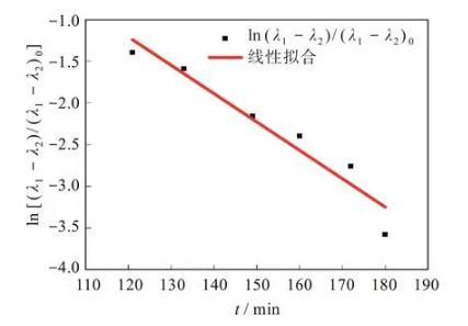 通過實(shí)驗(yàn)可以得到L和B的時(shí)間演化,界面張力可以通過ln(λ1-λ2)/(λ1-λ2)0~t的斜率求得。通過軟件擬合出的形狀因子隨時(shí)間演化的圖形如圖5所示。利用式(1)~式(3)計(jì)算得到,PS/POE體系在230℃時(shí)系統(tǒng)的界面張力為0.397 mN/m。