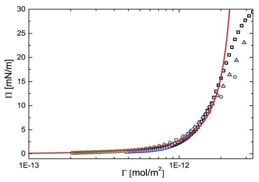 圖 2 表面壓力(P)與吸附的 PNIPAM 顆粒量 (G) 在空氣-水界面上。 開放符號表示實驗 對應于三組不同實驗的數(shù)據點 即:(,)具有高初始粒子負載的 NIMA 槽,(B)NIMA 低初始粒子負載的槽和 (D) Kibron m 槽 高初始粒子負載。 紅色實線表示預測 使用 Groot 和 Stoyanov 模型制作。