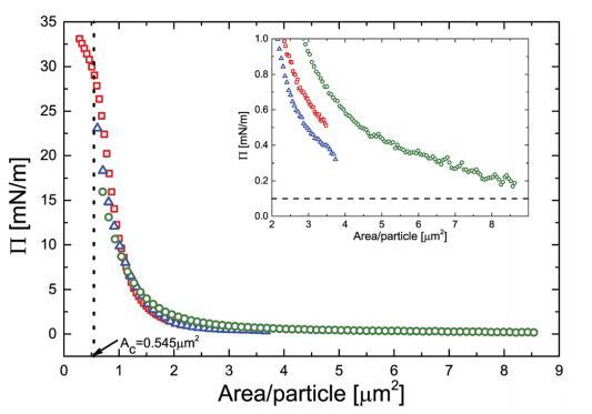 壓力面積等溫線是通過壓縮獲得 在朗繆爾槽上涂抹單層膜,用于 3 組不同的 實驗。 這些等溫線中的區(qū)域坐標被縮放 由吸附在界面上的顆粒數(shù)量決定。 一切 曲線折疊成單個圖,如圖 1 所示。 增加壓縮,壓力最初變化很小,但 每個顆粒低于 2 mm2,壓力會急劇增加。 曲線的斜率首先增加,但達到 最大在 ~27 mN m- 1 處有一個拐點 其次是稍弱的斜率。 面積值 對應于該拐點的粒子 (Ac) 結果為 為 0.545 mm2,如圖 1 中的虛線所示。假設 顆粒緊密堆積,這對應于~835 nm 的顆粒間距離,遠大于 在本體中測量的顆粒的流體動力學直徑 溶液 (590 nm) 表明顆粒確實是 大幅度變形。 如圖 1 的插圖所示,有限 0.5 mN m- 1 級的表面壓力(即遠高于我們的 檢測限為 0.1 mN m- 1 ) 事實上已經可以測量了 每個粒子的面積約為 4 mm2 . 插圖還表明 P 的絕對值可再現(xiàn)在 0.3 mN m- 1 以內 在兩個不同朗繆爾的不同實驗之間 槽。