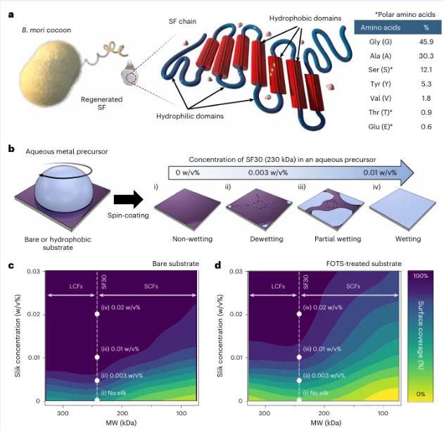 圖1作為天然表面活性劑的SF。b,旋轉涂層金屬水合物提高表面覆蓋率的示意圖。金屬水合物溶液的表面覆蓋率的示意圖。c,d,添加了SF的金屬水溶液的表面覆蓋率(%)。的表面覆蓋率(%)?;祝╟)和基底上的表面覆蓋率(%)?;祝╠)上SF添加的金屬水溶液的表面覆蓋率(%)與濃度和分子量的函數關系。