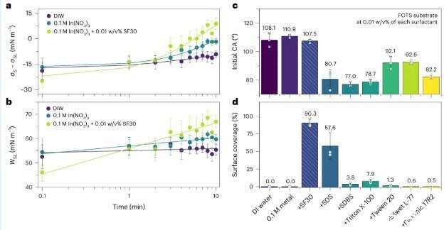 圖2利用絲表面活性劑進行高效的界面能控制。水溶液中SF在水溶液中的界面張力(a)和粘附功(b)的隨時間變化。(d)與其他商用和最先進表面活性劑的比較。表面活性劑。在a和b中,數據點和誤差條表示平均值±標準偏差(s.d.標準偏差(s.d.)(樣本量為4),直線表示線性回歸。在c和d中,點表示數據點。色條和誤差條顯示平均值±標準差(樣本量3)