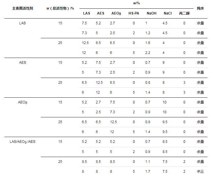由前文可知,不同表面活性劑在膠束形態(tài)、增稠、去污等多個(gè)方面均有不同表現(xiàn)。對于結(jié)構(gòu)型洗滌劑,考察不同主表面活性劑的區(qū)別,同時(shí)探究了HS-PA在形成結(jié)構(gòu)型洗滌劑中發(fā)揮的作用。與增稠性能類似,不同配方體系形成結(jié)構(gòu)型洗滌劑所需添加的鹽量也不同。因此,在設(shè)計(jì)配方時(shí),只要求同組的實(shí)驗(yàn)樣品(含HS-PA)和空白樣品(不含HS-PA)的鹽量相同(制備樣品時(shí),以鹽量加至空白組出現(xiàn)剪切變稀的現(xiàn)象為準(zhǔn)),具體配方如表2所示(表中LAS、AES已換算為純質(zhì)量分?jǐn)?shù),HS-PA(w=30%)未換算)。