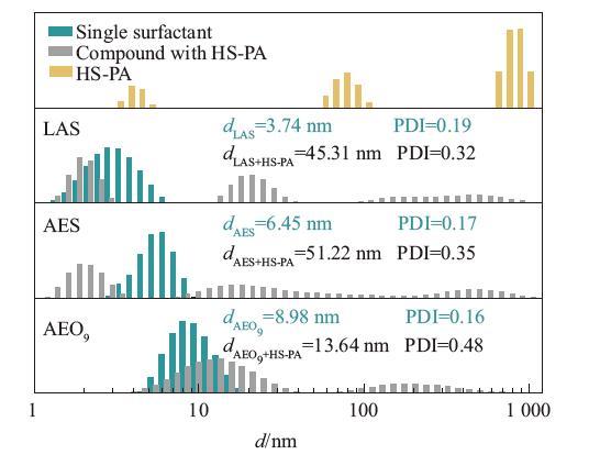 為了探究高分子表面活性劑在水溶液中聚集行為,考察了常規(guī)表面活性劑與HS-PA復(fù)配前后的膠束粒徑變化。由圖3的結(jié)果可知,3種低分子量表面活性劑的聚集體尺寸及分布情況比較相似,其粒徑均小于10 nm,呈現(xiàn)出單峰分布。LAS、AES和AEO9的平均膠束粒徑分別為3.74,6.45和8.98 nm。PDI越大,說明其粒徑分布越寬,高分子表面活性劑HS-PA的PDI大于0.5,其粒徑情況不適合用平均粒徑值表示,因此未在圖中提供平均粒徑的數(shù)據(jù)。從圖3中HS-PA的粒徑分布情況可以看出,其聚集體為多峰分布,且分布較寬。粒徑為3~5 nm的聚集體可能是HS-PA的單分子膠束。與低分子量表面活性劑不同,在稀溶液中,高分子表面活性劑結(jié)構(gòu)中的疏水鏈段傾向于聚集,分子卷縮,可自身形成單分子膠束,該現(xiàn)象曾被許多研究報(bào)道。粒徑為50~110 nm以及650~1 000 nm的為HS-PA的有序多分子聚集體,如膠束、小囊泡等。HS-PA分子量大,分子中的疏水鏈段和親水鏈段長,導(dǎo)致其有序多分子聚集體的粒徑明顯比低分子量表面活性劑大。