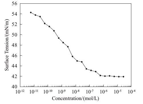 HS-PA的γ-c曲線如圖2所示。從圖2中可以看出,在純水中,HS-PA的臨界膠束濃度約為3×10-7 mol/L(即0.012 g/L),表面張力最低可降至42.06 mN/m。與其他文獻(xiàn)報(bào)道的改性聚丙烯酸/酯高分子表面活性劑相比,HS-PA的γcmc屬于中等水平。大多數(shù)高分子表面活性劑的表面活性比較差,這可能是由于其分子量大,分子鏈易于卷曲,分子內(nèi)或分子間的纏繞較為復(fù)雜,疏水鏈易于被親水鏈覆蓋。在洗滌劑配方中作為主表面活性劑的低分子量表面活性劑,其表面張力大多在35 mN/m以下。因此,HS-PA更適合作為輔助型高分子表面活性劑在洗滌劑中發(fā)揮作用。
