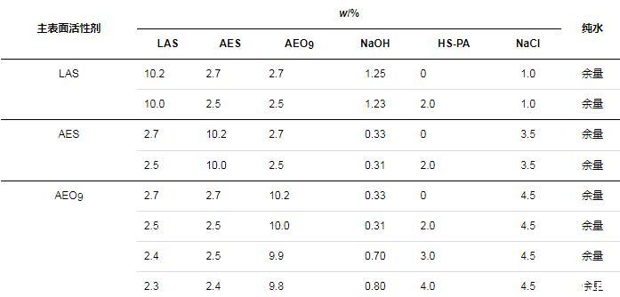 分別考察了在以LAS、AES和AEO9為主要表面活性劑的體系中,HS-PA作為改性聚丙烯酸/酯高分子表面活性劑可發(fā)揮的增稠以及去污效果。在配方設(shè)計(jì)上,總活性物質(zhì)量分?jǐn)?shù)約為15%。由于HS-PA的增稠作用需要和NaCl協(xié)同起效,而不同配方的耐鹽性不同,因此,根據(jù)空白組(無HS-PA)配方黏度不反稀的NaCl用量,來確定同組樣品(含HS-PA)的NaCl用量,具體配方如表1所示(表中LAS、AES已換算為純質(zhì)量分?jǐn)?shù),HS-PA(w=30%)未換算)。