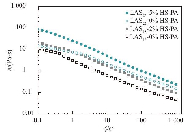 圖7為不同配方洗滌劑的表觀黏度隨剪切速率變化曲線,隨著剪切速率不斷增加,4個(gè)樣品的表觀黏度均逐漸減小,表現(xiàn)出剪切變稀的非牛頓流體行為。在恒定剪切速率下,體系中加入HS-PA將提高洗滌劑的黏度。結(jié)合偏光顯微鏡圖像可知,HS-PA的加入使得分子空間堆積構(gòu)型發(fā)生改變,體系中出現(xiàn)更多的球形層狀液晶,液晶結(jié)構(gòu)越多越完整,則說明其形成的聚集體中,分子排布越緊密且越有序,層間發(fā)生滑動(dòng)時(shí)越困難,宏觀表現(xiàn)為黏度越大。當(dāng)無HS-PA影響時(shí),在相同剪切速率下,活性物質(zhì)量分?jǐn)?shù)越高,黏度越大。這可能是因?yàn)榛钚晕镔|(zhì)量分?jǐn)?shù)越大,表面活性劑分子之間作用力越強(qiáng),分子鏈發(fā)生相對運(yùn)動(dòng)時(shí)的阻礙效果越明顯,黏度則越大。