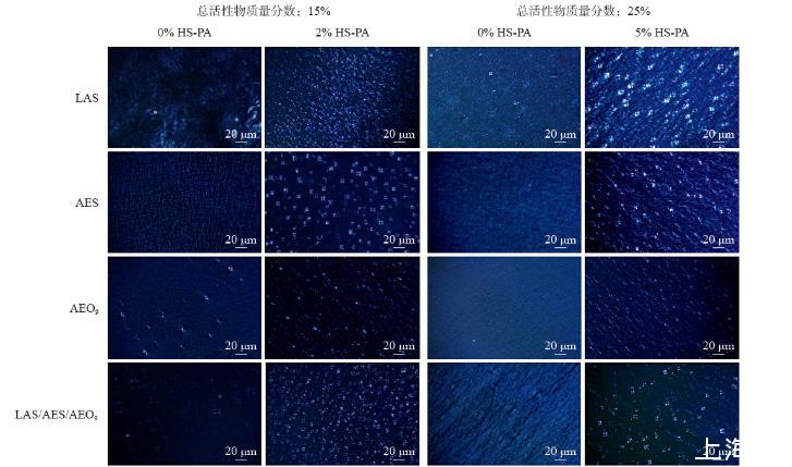 圖5為結(jié)構(gòu)型洗滌劑的偏光紋理圖(表2中的配方,以“主表面活性劑—總活性物質(zhì)量分?jǐn)?shù)—HS-PA質(zhì)量分?jǐn)?shù)”區(qū)分)。從圖中可以明顯看出,在分別以LAS、AES和AEO9為主表面活性劑的配方中,當(dāng)總活性物質(zhì)量分?jǐn)?shù)約為15%或者25%時(shí),加入HS-PA后,偏光圖像中的馬耳他十字液晶形狀均明顯增多。馬耳他十字是球形層狀液晶的典型織構(gòu),說明了HS-PA的加入有利于體系形成球形層狀液晶。當(dāng)體系中不含HS-PA時(shí),偏光視野并非完全暗場,而是有微弱的油狀條紋或者少量的馬耳他十字,表明其中也具有部分平面或者球形層狀液晶結(jié)構(gòu),但液晶較弱。不同主表面活性劑的層狀液晶結(jié)構(gòu)存在一些區(qū)別,AEO9為主表面活性劑的配方,其十字花紋理直徑為2~3μm,小于LAS、AES以及三元表面活性劑平衡體系的十字花紋理直徑(7~10μm)。以上結(jié)果與HS-PA復(fù)配體系中的粒徑分布變化相吻合:當(dāng)HS-PA與低分子量表面活性劑復(fù)配時(shí),LAS/AES與HS-PA的混合膠束粒徑明顯變大,但AEO9與HS-PA的混合膠束粒徑只略微變大。根據(jù)球形層狀液晶的結(jié)構(gòu)可知,其內(nèi)部混合膠束粒徑越大,則相應(yīng)的液晶粒徑越大。對于除AEO9外的其他3種體系而言,總活性物質(zhì)量分?jǐn)?shù)從15%提高到25%,HS-PA加量從2%增加至5%,球形層狀液晶的粒徑會(huì)相應(yīng)增大,此現(xiàn)象在LAS為主表面活性劑以及LAS較多的三元表面活性劑平衡體系中更為明顯。