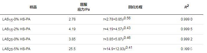 根據(jù)Herschel-Bulkley模型擬合的回歸方程及流變參數(shù)如表5所示(命名規(guī)則:主表面活性劑總活性物質(zhì)量分?jǐn)?shù)-HS-PA用量),其中擬合曲線相關(guān)系數(shù)(R2)均不小于0.999,相關(guān)性較高,表明LAS體系的流變性可以利用Herschel-Bulkley模型進(jìn)行研究。在活性物質(zhì)量分?jǐn)?shù)為15%的體系中添加2%HS-PA,屈服應(yīng)力從原先的2.78 Pa提高至4.19 Pa,在25%活性物配方中加入5%HS-PA,屈服應(yīng)力由3.85 Pa提高至25.5 Pa,說明HS-PA的添加可以提高體系的屈服應(yīng)力。屈服應(yīng)力是指液晶結(jié)構(gòu)破壞時(shí)的臨界剪切應(yīng)力值。由前文研究結(jié)果可知,HS-PA的加入使配方獲得更多更致密的球形層狀液晶,因此,相應(yīng)地,體系屈服應(yīng)力也越大。而屈服應(yīng)力越大,當(dāng)體系中包含水不溶粒子(如微膠囊)時(shí)越容易穩(wěn)定,該結(jié)果與離心測試結(jié)果相契合。