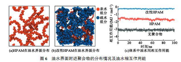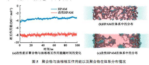 界面張力來自于界面處分子受到的應力不均衡,因此需要增加兩相之間的聯(lián)系,從而減少界面張力。由于HPAM分子本身親水,與水相具有較強的相互作用,因此主要考察HPAM和油相之間的相互作用強度。圖5(a)為HPAM和改性HPAM與油相的相互作用能隨時間的變化。可以看出,HPAM在0~100 ns的模擬過程中相互作用強度逐漸降低,說明部分HPAM從油水界面處脫離進入水相。由圖5(b)也看出HPAM分子大量均勻分布在水相中,其主要原因也是缺少親油基團,不易在界面處穩(wěn)定存在,更傾向于溶解于水中。而引入疏水基團改性后的HPAM與油相的相互作用能明顯強于HPAM與油相的作用能。由圖5(c)看出改性HPAM大多數(shù)分布在油水界面附近。改性HPAM在界面處橋接了油相與水相,緩解了界面處分子應力不均衡,從而起到降低界面張力的效果。