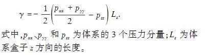 每個模型都經(jīng)過100 ns的MD模擬,保證油水界面充分達到平衡狀態(tài),油水界面張力的計算采用50 ns的數(shù)據(jù),通過3次獨立模擬獲得界面張力數(shù)值。本文中對界面張力(IFT)的計算方法選用Gibbs界面張力計算法,模型中油水界面位于XY平面內(nèi),界面張力計算公式為
