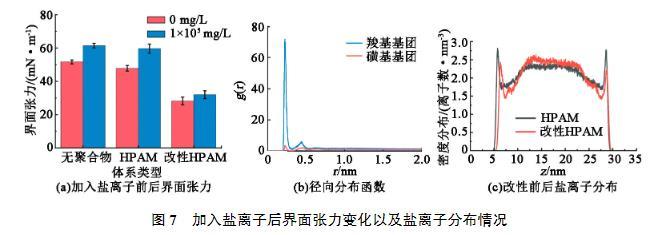部分儲層中存在較高的礦化度,為此進一步研究鹽離子對界面張力的影響。在3個體系的水相中分別加入質(zhì)量濃度為100 g/L的NaCl,觀察其對界面張力的影響情況,結果見圖7(a)。可以看出,對于沒有聚合物存在的體系中,界面張力會隨著鹽離子的增加而增大。這是由于鹽離子的存在增大了水相的極性,從而拉大了油水兩相性質(zhì)上的差距,增大了油水界面張力。因此當界面處的鹽離子增多時,界面張力則會增大。加入HPAM的體系中也出現(xiàn)了類似的情況。然而引入磺酸基團改性后的HPAM則受鹽離子的影響較小。為了解釋這一現(xiàn)象的物理機制,分析了帶電基團周圍Na+分布(圖7(b))。通過計算徑向分布函數(shù)g(r),發(fā)現(xiàn)羧酸基團周圍吸引了較多的Na+,導致Na+在聚合物附近聚集,而改性引入的磺酸基團具有一定的抗鹽作用,其周圍分布的Na+數(shù)量更少。這也就導致2種體系界面附近Na+密度不同(圖7(c))。由于HPAM含有較多的羧酸基團,會引起Na+在聚合物附近的富集,導致界面張力的增加。而在加入改性HPAM后,引入的磺酸基團對Na+的吸引力較弱,導致界面附近的Na+和改性前相比有明顯的減少,界面張力增加較少。因此加入磺化改性的HPAM在高礦化度下仍然可以保持較高的界面活性。