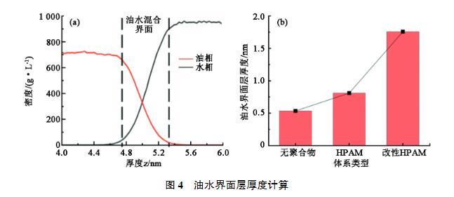 界面層厚度能夠反映油水界面處兩相的混合情況,一般來說界面厚度越大說明兩相之間的排斥越小,互溶效果越好,界面張力越低。參考Ricardo Paredes等的方法,選取密度低于油和水密度峰值90%的區(qū)域作為油水混合界面,如圖4(a)所示。計算得到的界面層厚度見圖4(b)。可以發(fā)現(xiàn),加入HPAM對于界面層影響很小,改性HPAM的加入可以大幅提高油水界面層厚度。這也反映出未改性HPAM油水界面依然比較清晰,兩相界限明顯,界面處油分子和水分子受力不均勻的現(xiàn)象依然嚴重;改性HPAM疏水基團進入油相中,引起z方向油水分布重疊區(qū)域變大,油水界面區(qū)域擴展,油水界面變得凹凸不平,油水相的“螯合”加強,界面處分子受力不均衡得到了緩解,有利于界面張力降低。