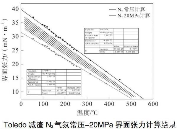 可以看到,根據(jù)文獻方法計算結果,對于Toledo減壓渣油來說,其在常壓條件下N2氣氛條件下的氣液界面的界面張力,當不在真臨界溫度(760℃)較近的溫度范圍內(nèi),都可以認為隨溫度呈現(xiàn)線性下降的趨勢。