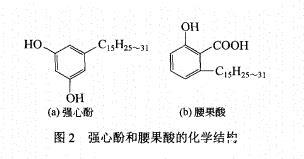 從圖1可以看出,兩種生物質(zhì)腰果酚磺酸鹽的收率隨著反應(yīng)溫度的升高先增加隨后變化較緩,而活性物含量先增大后減小。在磺化溫度為25℃時(shí),不飽和腰果酚磺酸鹽和飽和腰果酚磺酸鹽的活性物含量達(dá)到最大值,分別為84.0%和98.7%,此時(shí)收率也較高,分別為85.0%和88.9%。當(dāng)磺化溫度高于25℃時(shí),兩種腰果酚磺酸鹽的活性物含量降低,收率變化較小。分析原因可能為,磺化溫度太高,會(huì)導(dǎo)致過磺化,生成的副產(chǎn)物水溶性較差,導(dǎo)致活性物含量較低。在相同條件下,飽和腰果酚磺酸鹽的收率和活性物含量高于不飽和腰果酚磺酸鹽,這主要是由于不飽和腰果酚中含有一定量的雜質(zhì)強(qiáng)心酚和腰果酸,結(jié)構(gòu)見圖2。這兩種物質(zhì)的結(jié)構(gòu)與腰果酚的結(jié)構(gòu)相似,分離難度較大;且這兩種物質(zhì)也發(fā)生磺化反應(yīng),導(dǎo)致不飽和腰果酚磺酸鹽的活性物含量較低。然而通過對不飽和腰果酚進(jìn)行側(cè)鏈加氫生成飽和腰果酚后,物理性質(zhì)發(fā)生變化,飽和腰果酚為棕色固體,強(qiáng)心酚和腰果酸為液體,很容易分離。因此,飽和腰果酚磺酸鹽的活性物含量高于不飽和腰果酚磺酸鹽。