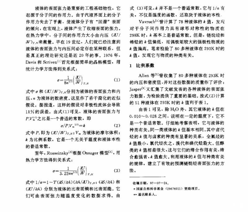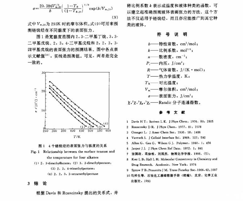 對Davis和Rosseinsky提出的關系檢驗表明,液體的表面張力σ與P1Vm1/3之比不僅取決于溫度,還與液體的種類有關,據此,建立了一個能由鏈烷烴的分子結構準確預測其表面張力的方法。