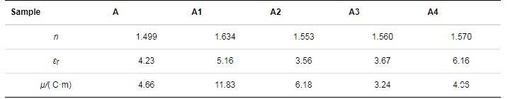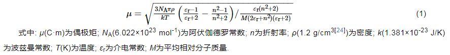 式中:μ(C·m)為偶極矩;NA(6.022×1023mol-1)為阿伏伽德羅常數;n為折射率;ρ(1.2 g/cm3)為密度;k(1.381×10-23J/K)為波茲曼常數;T(K)為溫度;εr為介電常數;M為平均相對分子質量。