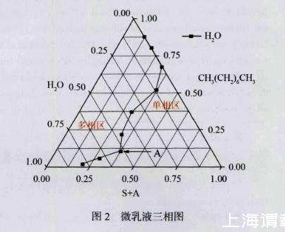 室內研究中選用表面活性劑和助表面活性劑組合(S+A)為Tween 80、十八烷基二甲基溴化銨和正丁醇,油相為正辛烷,乳化溫度設為75℃時,制備WinsorⅣ型單相納米乳液;其中,S+A與油相正辛烷按9∶1、8∶2、7∶3、6∶4、5∶5、4∶6、3∶7、2∶8和1∶9依次混合,然后逐滴加入蒸餾水,觀察加入蒸餾水后乳液的澄清渾濁現象來確定H2O/(S+A)/正辛烷體系單相微乳液的微觀結構類型,得到的相圖如圖2所示。選取三相圖中A點的微乳液用蒸餾水定容稀釋并以60 Hz頻率超聲波震蕩5 min后,制得納米乳液NR-A。