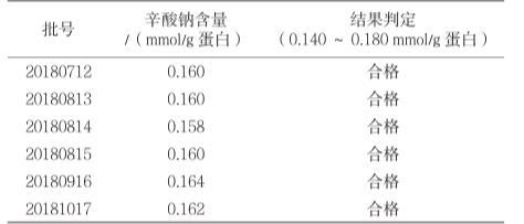 取每1 g蛋白質(zhì)中含0.130 mmol、0.160 mmol、0.190 mmol辛酸鈉的加標(biāo)回收率溶液作為供試品,每個(gè)濃度分別制備3份進(jìn)行測(cè)定,根據(jù)標(biāo)準(zhǔn)曲線計(jì)算辛酸鈉含量。