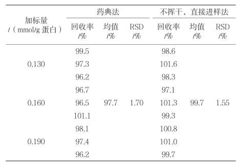由表3可知,藥典方法測(cè)得的9次回收率的平均值為97.7%,RSD值為1.70%;不揮干,直接進(jìn)樣法測(cè)得的9次回收率的平均值為99.7%,RSD值為1.55%。對(duì)兩組數(shù)據(jù)進(jìn)行單因素方法分析,F(xiàn)=7.530,P=0.02<0.05,兩組數(shù)據(jù)有顯著性差異。方法優(yōu)化后準(zhǔn)確度更接近100%,這是因?yàn)閮?yōu)化后的方法不受揮干速度的影響[3],進(jìn)樣溶液比藥典方法均勻,損失量相對(duì)較小。