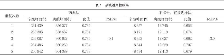 由表1可知,不揮干,直接進(jìn)樣法(優(yōu)化后的方法)所得峰面積較小,這是因?yàn)閮?yōu)化后方法的辛酸對(duì)照品溶液不揮發(fā)至干,直接進(jìn)樣使得濃度變低,峰面積變小,但不影響積分。連續(xù)5針辛酸峰與庚酸峰面積之比的RSD值由藥典方法的0.1%變?yōu)?.0%,但仍符合系統(tǒng)適用性要求(不大于5%)。實(shí)驗(yàn)時(shí)間由2 d縮短為1 d。