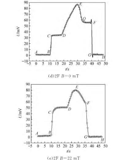 使用拉脫法測量了磁性液體的磁表面張力,無外加磁場作用時,磁性液體的表面張力小于其載液的表面張力,磁性液體液膜拉得更長,液膜收縮的趨勢比白油更明顯,這主要是因為磁性液體中加入的表面活性劑降低了其表面張力。由液膜拉脫過程電壓變化曲線可觀察到:不同條件下磁性液體的電壓變化情況不同,無外加磁場作用時2F號磁性液體在EF階段存在轉折點Q,越過轉折點,QF階段電壓變化較平緩,且表面張力越小;而7#白油和1F磁性液體并未出現(xiàn)此現(xiàn)象,這主要是因為7#白油和1F磁性液體表面張力較大,2F號磁性液體由于表面張力較小,其液體分子與分子之間的作用力較弱,宏觀表現(xiàn)為拉脫的液膜更長,液膜在空氣中會存在一段時間。有外加磁場作用時,2F號磁性液體在FG階段并未出現(xiàn)電壓變化平緩的中間過程,但FG階段出現(xiàn)了另一些數(shù)據(jù)點,液膜破裂的時間大于無外加磁場作用時的時間,主要是由于外加磁場增強了磁性顆粒之間的相互作用,分子和分子之間的磁吸引力增強,導致液膜逐步破裂。
