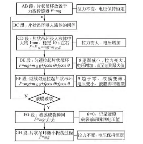 根據(jù)受力情況將圖4的液膜拉脫過程電壓變化曲線分為6個階段,圖5為液膜拉脫過程方框圖,不同階段片狀吊環(huán)的受力情況不同,電壓變化值也不同,在液膜破裂前后瞬間,忽略液膜的重力,表面張力與重力方向完全一致,此時F=mg+f1+f2,可得到液體的表面張力。由圖4發(fā)現(xiàn),不同液體在EF階段的電壓變化情況不同,無外加磁場作用時2F號磁性液體在EF階段存在轉折點Q,越過轉折點,QF階段電壓變化較平緩,且表面張力越小;而7#白油和1F磁性液體并未出現(xiàn)此現(xiàn)象。出現(xiàn)該現(xiàn)象的原因是7#白油和1F磁性液體表面張力較大,當液膜被拉脫到一定程度時,很快破裂;而2F號磁性液體由于表面張力較小,液體分子與分子之間的作用力減弱,宏觀表現(xiàn)為拉脫的液膜更長,液膜在空氣中會存在一段時間,此時液膜質(zhì)量很小,可忽略不計,電壓變化較平緩。有外加磁場作用時,1F和2F號磁性液體在FG階段并未出現(xiàn)電壓變化平緩的中間過程,但有外加磁場作用于磁性液體時,F(xiàn)G階段出現(xiàn)了一些數(shù)據(jù)點,液膜破裂的時間大于無外加磁場作用時的時間,主要是由于外加磁場增強了磁性顆粒之間的相互作用,分子和分子之間的磁吸引力增強,導致液膜逐步破裂。
