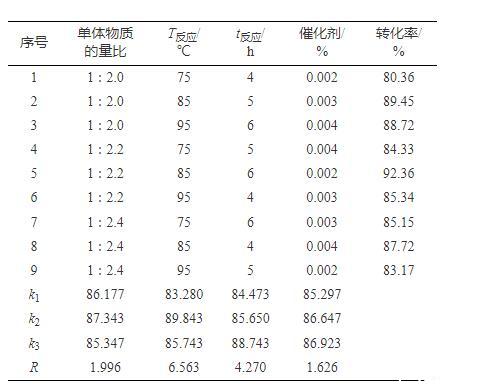 異丙醇占單體總質量的30%,設計正交實驗來確定中間體雙端環氧基改性聚硅氧烷(DEPS)合成的最佳條件,四個影響因子分別為DHSO與AGE的物質的量比、反應溫度、反應時間、催化劑加量(以鉑記,對單體總質量),對每個因子設定3個水平。正交實驗優化反應條件見表1。