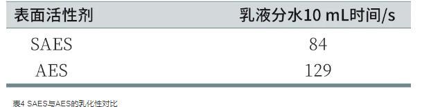 乳化作用是在一定的外力作用下使不混溶的兩種液體形成具有一定穩定性的液液分散體系的作用,該分散體系被稱為乳狀液,是一種熱力學不穩定體系。為了評估SAES和AES的乳化性,采用量筒法測定了二者對液體石蠟的乳化能力,記錄從乳液中分離出10 mL水所需要的時間,時間越長,乳化性能越好。SAES與AES的乳化性對比如表4所示。從表中可以看出,SAES的乳化性低于AES,這可能是因為SAES分子中的支鏈結構,使得其分子總體積相對較大,在空間位阻以及電性斥力作用使疏水基難以插入油相中,即與液體石蠟之間的相互作用較弱,乳化性較差。
