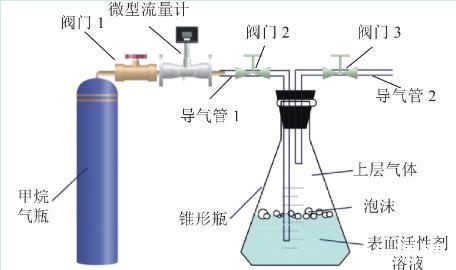 采取自主研發的泡沫對氣體緩釋效應試驗裝置進行試驗,試驗裝置如圖2所示。將250 mL表面活性劑溶液置于密閉錐形瓶,使用微型流量計控制甲烷氣體勻速向表面活性劑溶液中以300 mL/min速度通入50 mL氣體。試驗具體步驟如下: