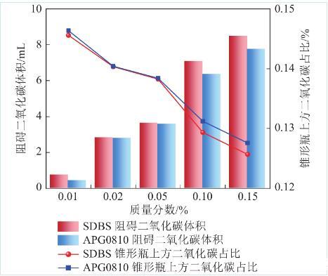圖12為注入二氧化碳的氣相色譜檢測結果,計算出表面活性劑泡沫對二氧化碳的緩釋作用結果如圖12柱狀圖所示。相同質量分數下,SDBS溶液對二氧化碳的緩釋效應優于APG0810。然而兩種表面活性劑對二氧化碳緩釋效應均不顯著,SDBS表面活性劑溶液在質量分數最大時10 min內只控制了8.46 mL二氧化碳氣體,APG0810只控制了7.74 mL二氧化碳氣體。