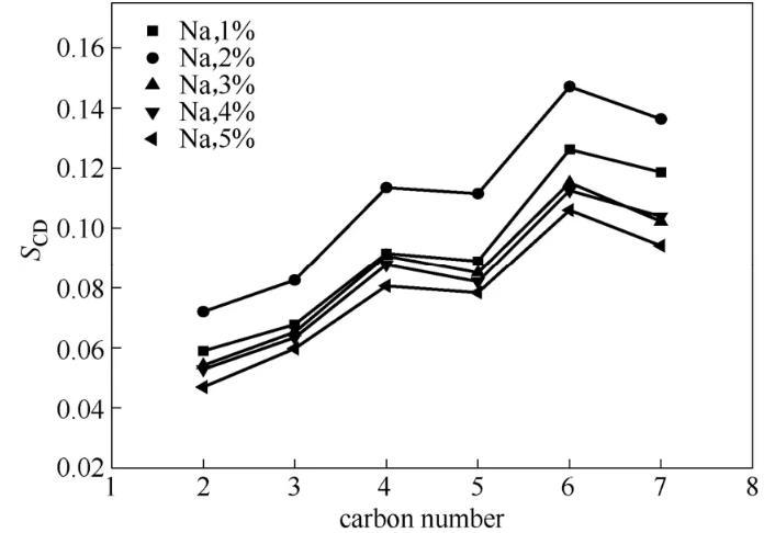 下面同樣通過疏水鏈碳原子序參數的變化來進一步驗證OPES的抗鹽性。從圖8中可以看出,在同一體系中隨著碳原子的增加序參數值增大,這說明越接近疏水尾鏈的末端的碳原子有序性越好。同時,對于NaCl濃度為1%、3%、4%、5%的體系,疏水尾鏈碳原子的序參數并未發生太大改變,NaCl濃度為2%時其序參數值還要大于1%時的序參數值,這說明在濃度為2%的NaCl溶液中疏水鏈碳原子間的相互作用力最強。