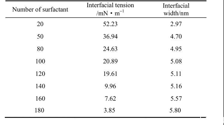 從表1可以發現表面活性劑數量的增加使得界面張力逐漸下降。其中當OPES數量由20增加到80時,界面張力值較高,這說明當表面活性劑濃度較低時并不能起到很好的降低界面張力的作用;隨著表面活性劑數量進一步增加界面張力逐漸下降,當OPES數量為180時,達到臨界飽和狀態,此時界面張力僅為3.85 mN·m-1,此變化規律與真實實驗規律相同。這同時也說明辛基酚聚氧乙烯醚磺酸鹽可以很好地降低界面張力,是一種性能優良的表面活性劑。界面寬度用體系密度圖中表面活性劑的密度曲線寬度來表示。隨著表面活性劑個數增加界面寬度遞增,起初界面寬度增加速度較快是因為界面OPES濃度過低并未飽和;當OPES數量達到100~140時,界面寬度僅有少量緩慢增加這是由于此時界面正在逐漸接近飽和狀態。隨著OPES的數量達到160和180時,界面寬度增加幅度變大,進一步驗證此時界面已達到飽和狀態。