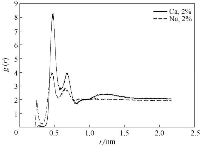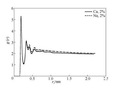 圖10中曲線分別代表在2%NaCl溶液、2%CaCl2溶液中磺酸基中的氧原子與水中氫原子之間的徑向分布函數,如圖所示兩條曲線的峰值并未有太大差別,這說明OPES對Na+、Ca2+都有很好的抗鹽性。