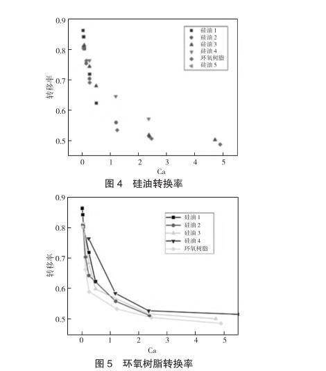 對不同黏度以及拉伸速度下的膠液進行測量并計算轉(zhuǎn)移率,如圖4所示,在忽略慣性力的條件下,采用無量綱數(shù)Ca來表示轉(zhuǎn)移率,對于表面張力相似且不同黏度的四種甲基硅油的轉(zhuǎn)移率有著相似的收斂情況。為了進一步印證Ca對轉(zhuǎn)換率的影響,引入與甲基硅油不同表面張力的環(huán)氧樹脂進行對比實驗,如圖5所示,表面張力較大的環(huán)氧樹脂的轉(zhuǎn)換率會比甲基硅油小,但整體趨勢相差不大,均會收斂到一定數(shù)值。之后,為了了解慣性力對轉(zhuǎn)移率的影響,選擇黏度較小的膠液進行實驗,同時加大移液針直徑使其脫離微量點膠的范圍,以提高慣性力對膠液傳遞的影響,如圖6所示,在通過增加膠液體積以提高慣性力影響的實驗中,膠液轉(zhuǎn)移率的變化與之前有極大差異。
