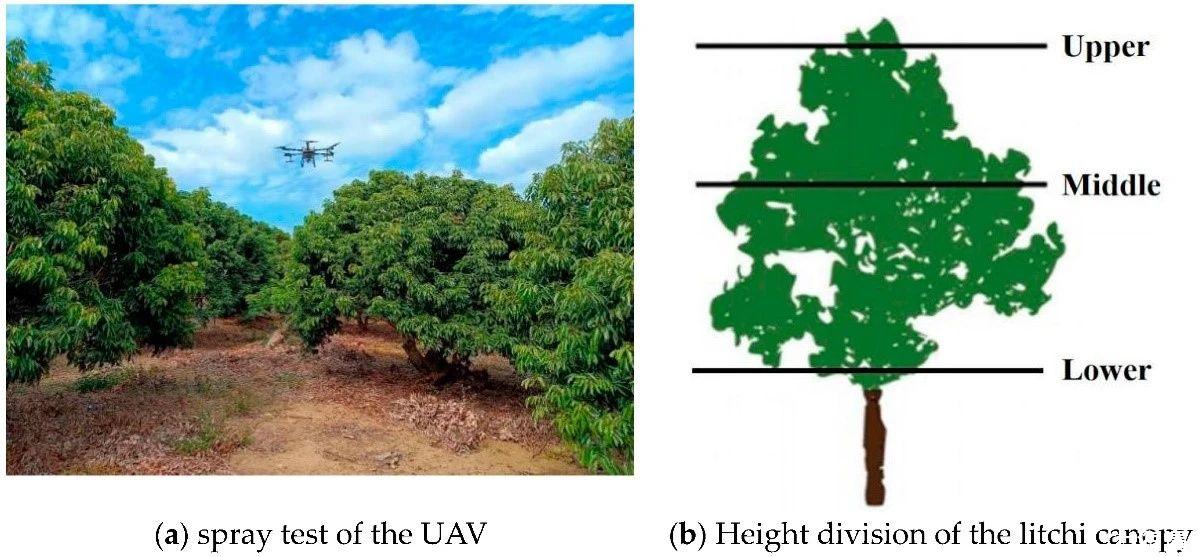 圖1.T30植保無人機(jī)噴霧機(jī)在荔枝園噴霧沉積測(cè)量。
