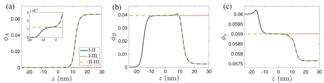 圖2.I-II相界面處的物種濃度分布曲線與I-III相界面和II-III相界面的濃度分布曲線對(duì)比。藍(lán)色實(shí)線為I-II相界面的濃度分布曲線,左側(cè)為I相,右側(cè)為II相;紅色點(diǎn)線I-III相界面的濃度分布曲線,左側(cè)為I相,右側(cè)為III相;黃色虛線為II-III相界面的濃度分布曲線,左側(cè)為III相,右側(cè)為II相。